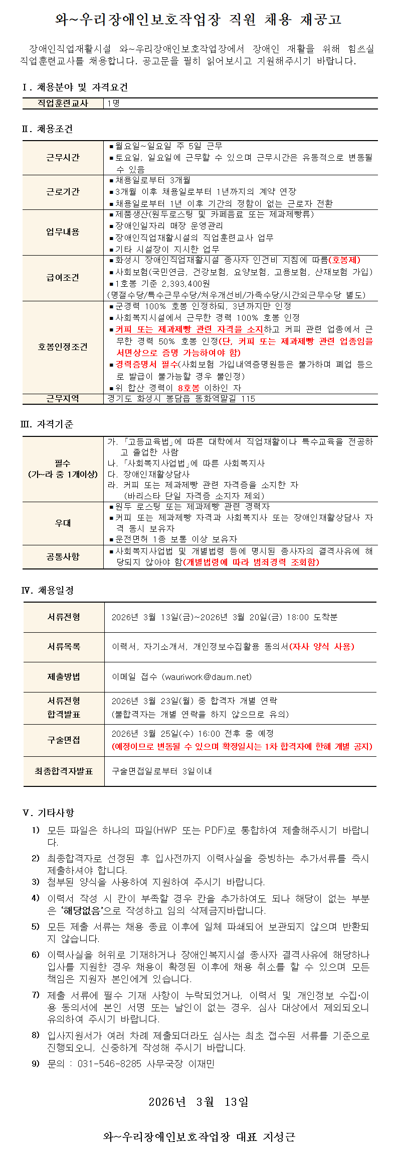 2차 장애인보호작업장 직업훈련교사 채용 재공고(마감)