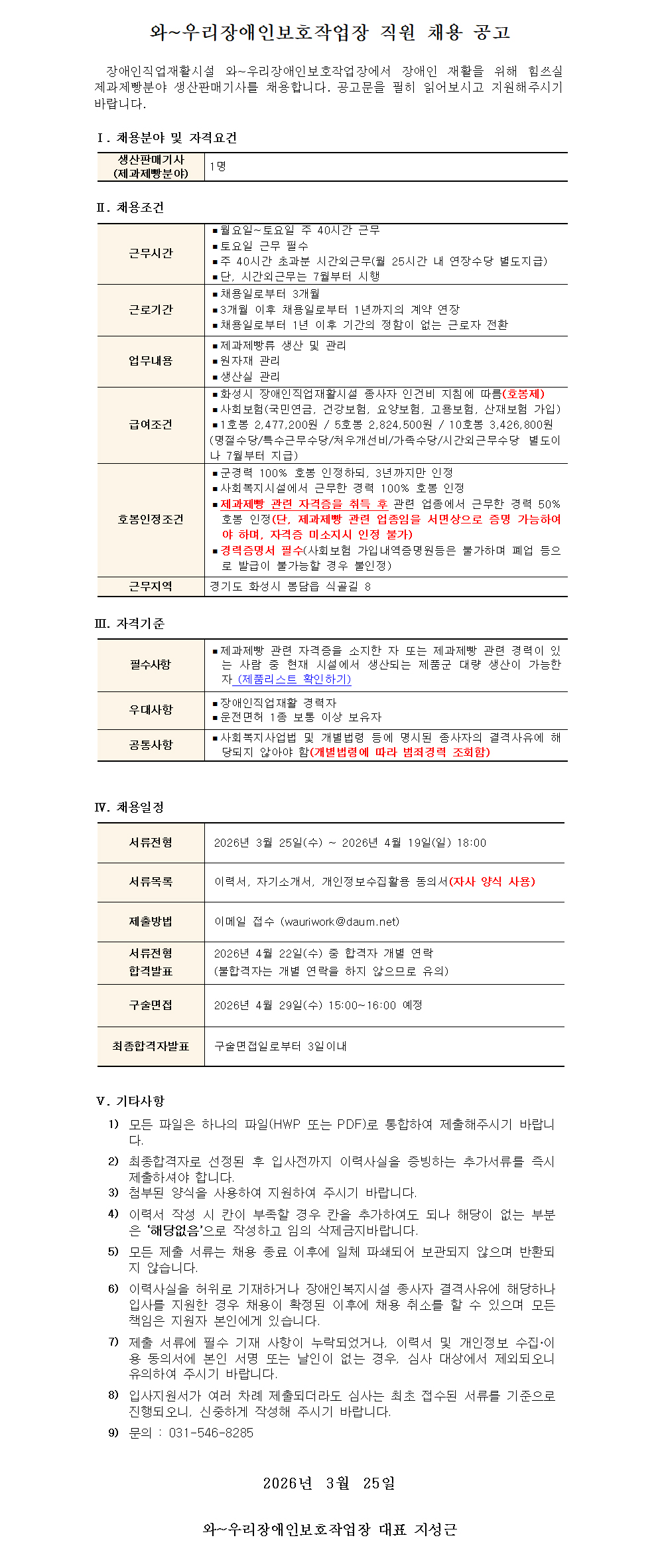 1차 장애인보호작업장 생산판매기사(제과제빵분야) 채용 공고(접수중)